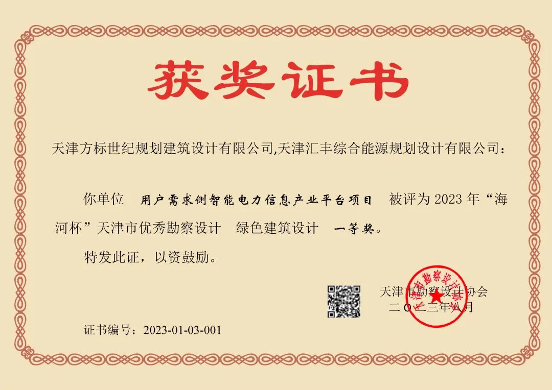 近日,由天津kaiyun开云电竞物联科技股份有限公司下属全资子公司:天津汇丰综合能源规划设计有限公司(以下简称“汇丰设计”)与天津方标世纪规划建筑设计有限公司联合申报的用户需求侧智能电力信息产业平台项目,荣获2023年“海河杯”天津市优秀勘察设计绿色建筑设计一等奖在绿色建筑类别中,为唯一的一项一等奖(绿色建筑类别中,共4个获奖项目,其中一等奖1项,二等奖1项,三等奖2项)。